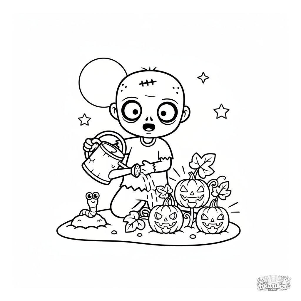 Página simple para colorear para pequeños de un zombi amigable regando calabazas brillantes de noche. Para 2-3 años. Formas grandes, detalles mínimos.