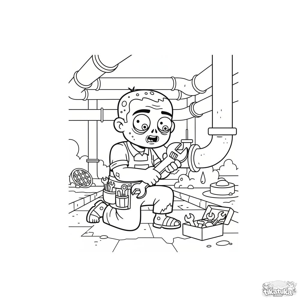 Página para colorear de un zombi fontanero arreglando una fuga en un colector de alcantarillado. Para niños de 7 a 9 años. Escena divertida y no aterradora.