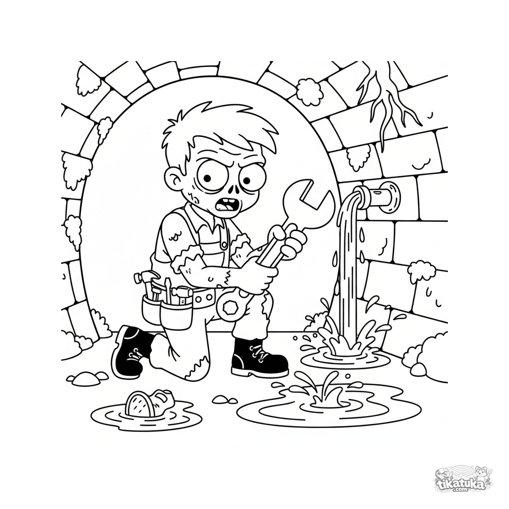 Página para colorear para niños de 4-6 años: un zombi fontanero amistoso arreglando una tubería en un túnel de alcantarilla. Escena divertida y no aterradora.