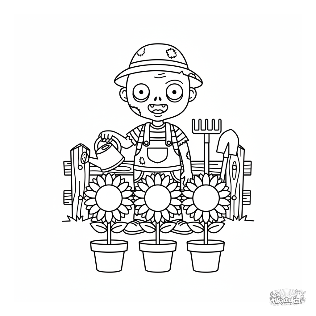 Página para colorear para niños pequeños: un zombi amigable con sombrero regando flores. Formas muy simples, detalles grandes, para niños 2-3 años.