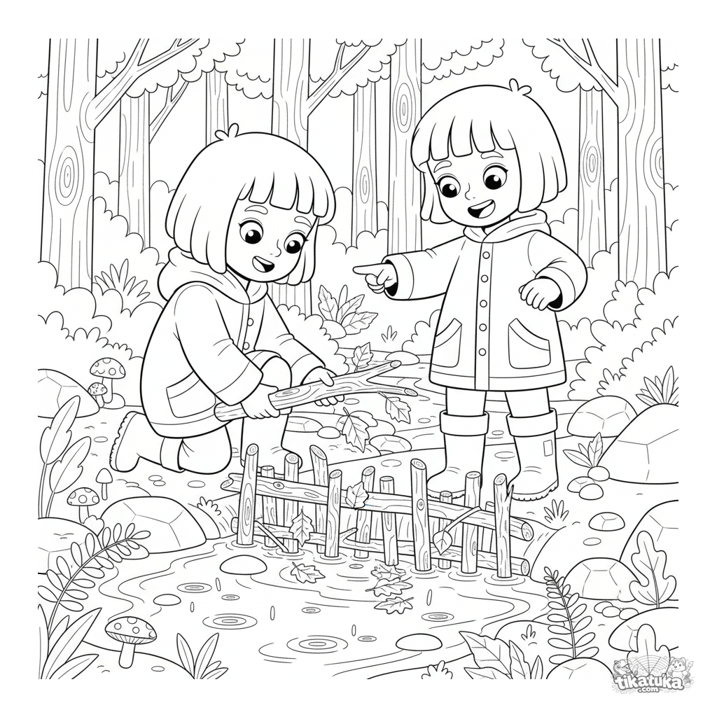 Página para colorear para niños de 10-12 años: dos amigos con impermeables construyen una presa de hojas en un arroyo del bosque bajo la lluvia otoñal. Escena detallada.