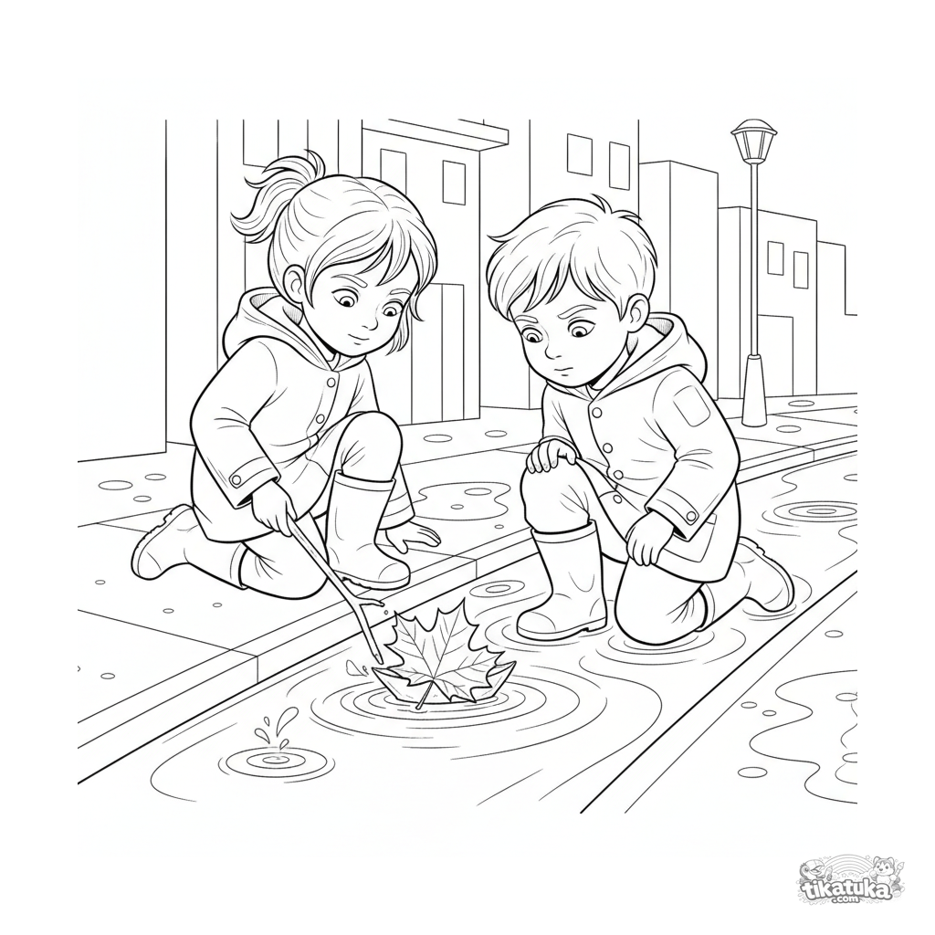 Página para colorear para preadolescentes de 7-9 años: dos amigos con impermeables hacen un barco de hojas en un arroyo de canalón. Escena con detalle moderado y fondo.
