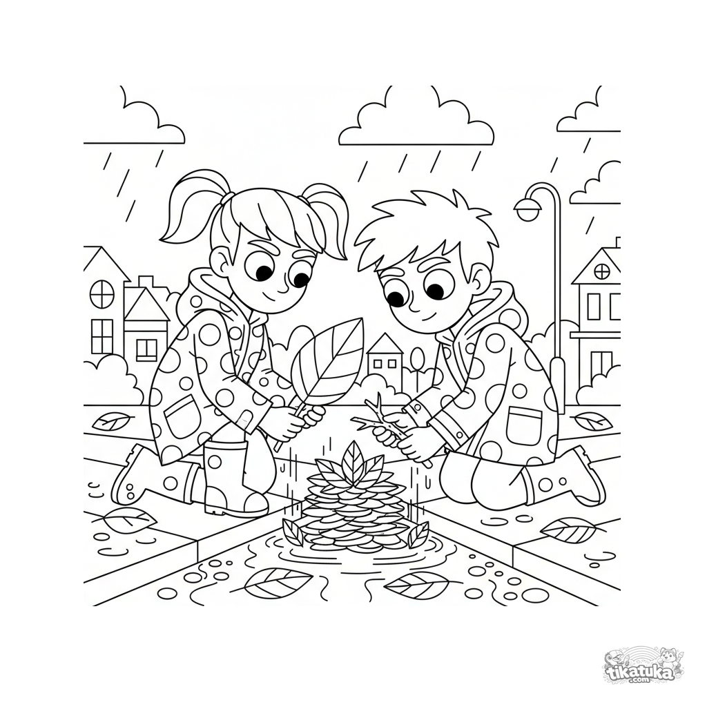 Página para colorear para niños mayores de 10-12 años: dos amigos con botas de goma construyen una presa de hojas en una alcantarilla bajo la lluvia de otoño.