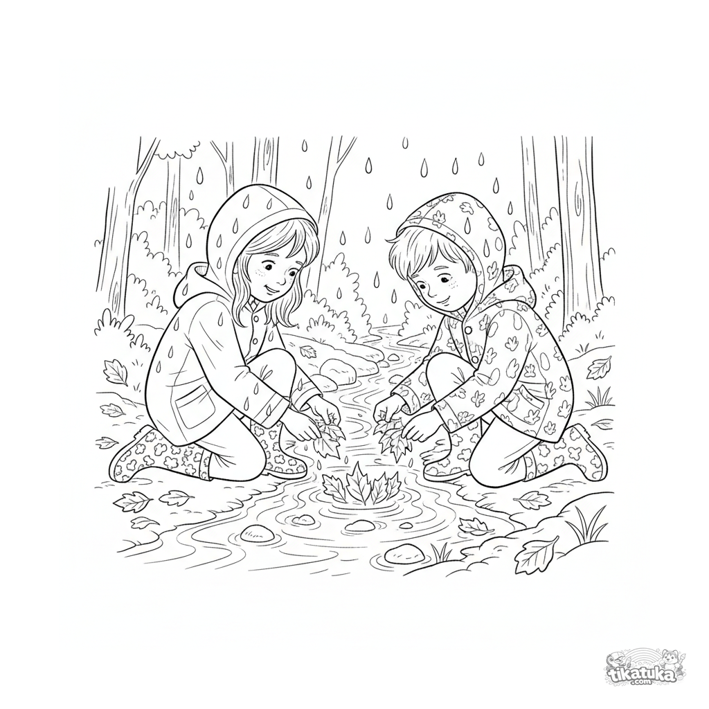 Página para colorear para mayores 10-12: dos amigos con impermeables construyen una presa de hojas en un arroyo bajo la lluvia.