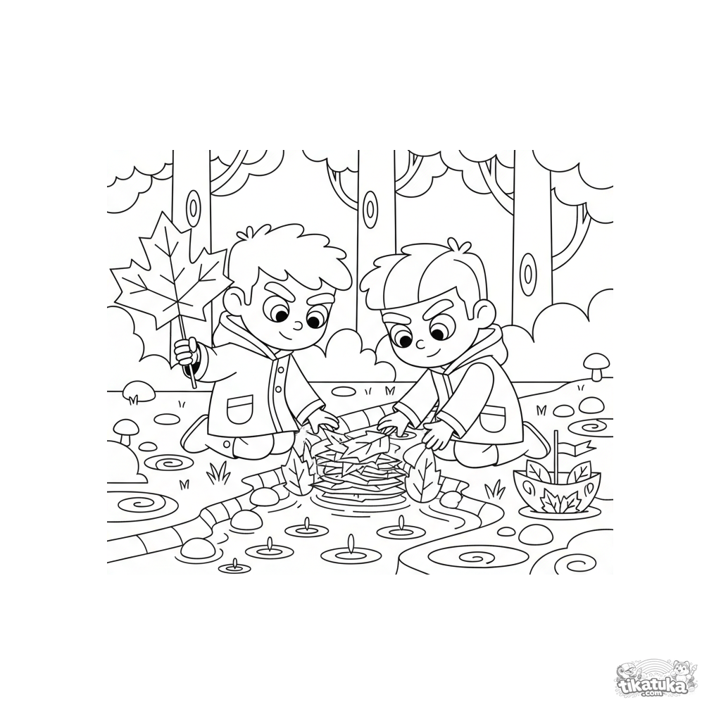 Página para colorear para niños 7-9 años: dos amigos con impermeables construyen una presa de hojas junto a un arroyo en otoño. Escena dinámica.