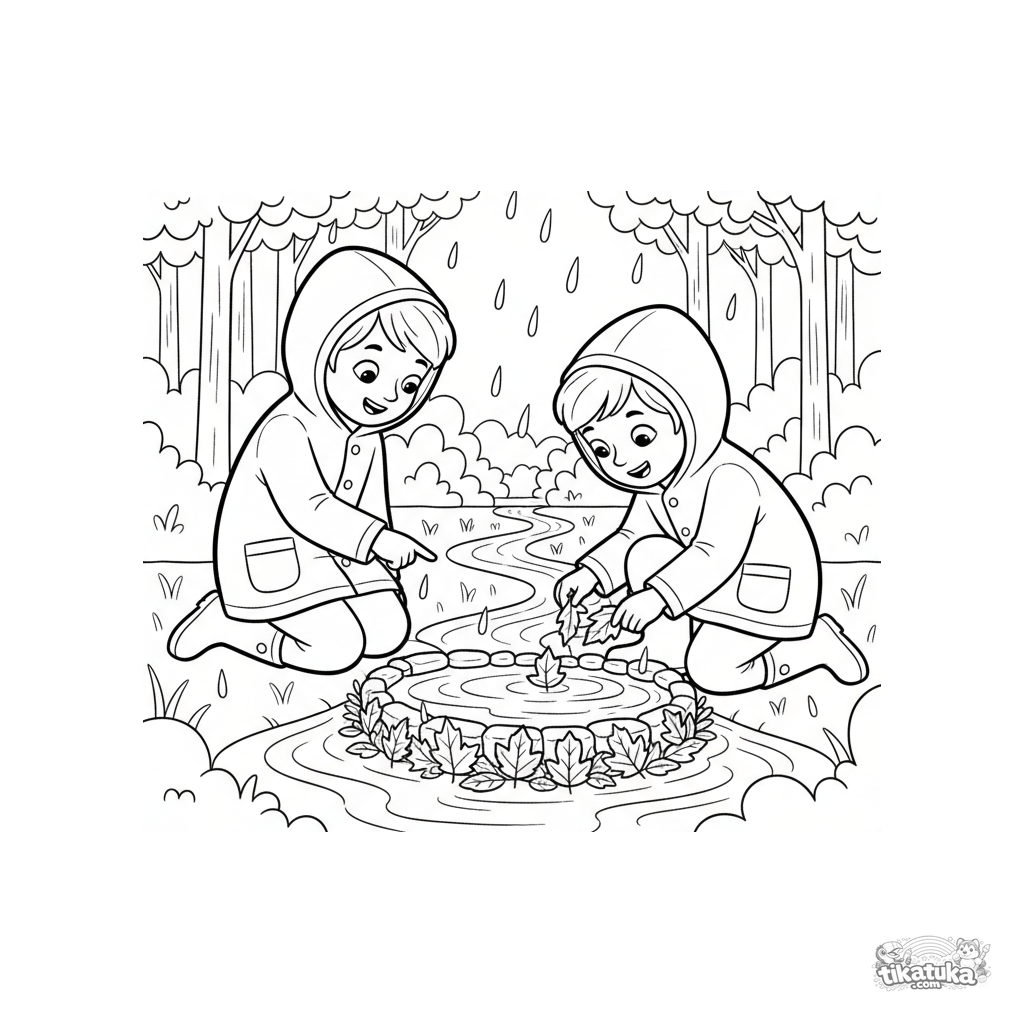 Página para colorear para niños (7-9 años): dos amigos con impermeables construyen una presa de hojas en un arroyo otoñal bajo la lluvia. Escena de acción con detalles.