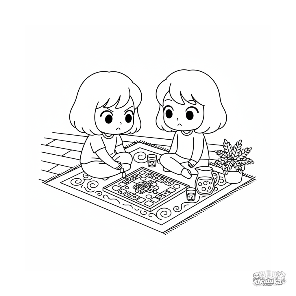 Página para colorear para niños de 7-9 años: dos amigos juegan un juego de mesa en una alfombra en el porche de una casa de verano. Escena con jarra de limonada.
