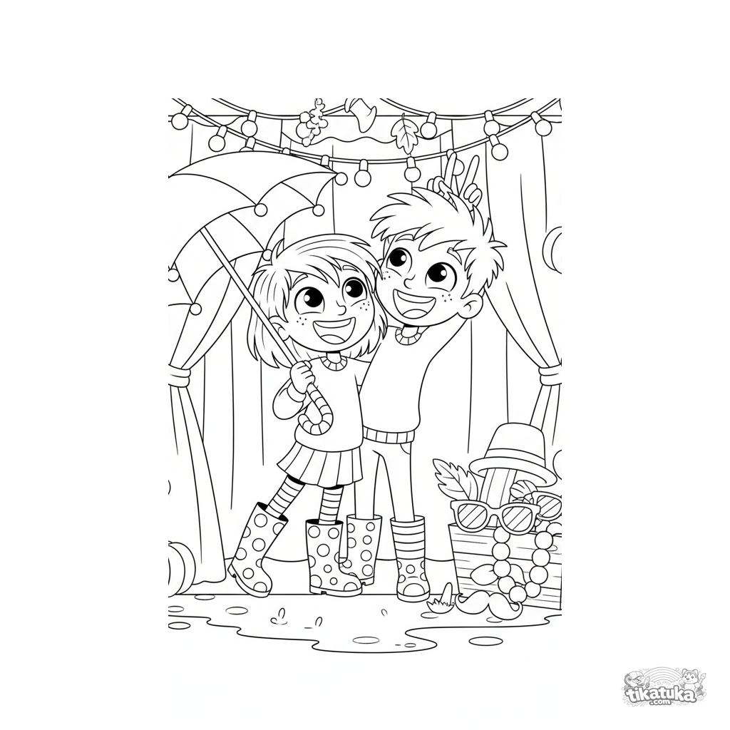 Página para colorear para preadolescentes de 7-9 años: dos amigos divirtiéndose en una cabina fotográfica en una feria de otoño lluviosa. Poses expresivas, fondo moderado.