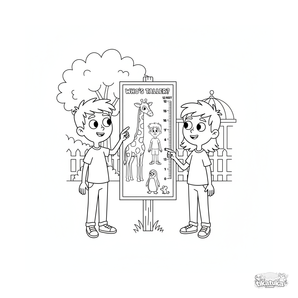 Página para colorear para niños de 7-9 años: amigos estudian una tabla que compara tamaños de animales. Escena educativa dinámica sobre altura y medición.