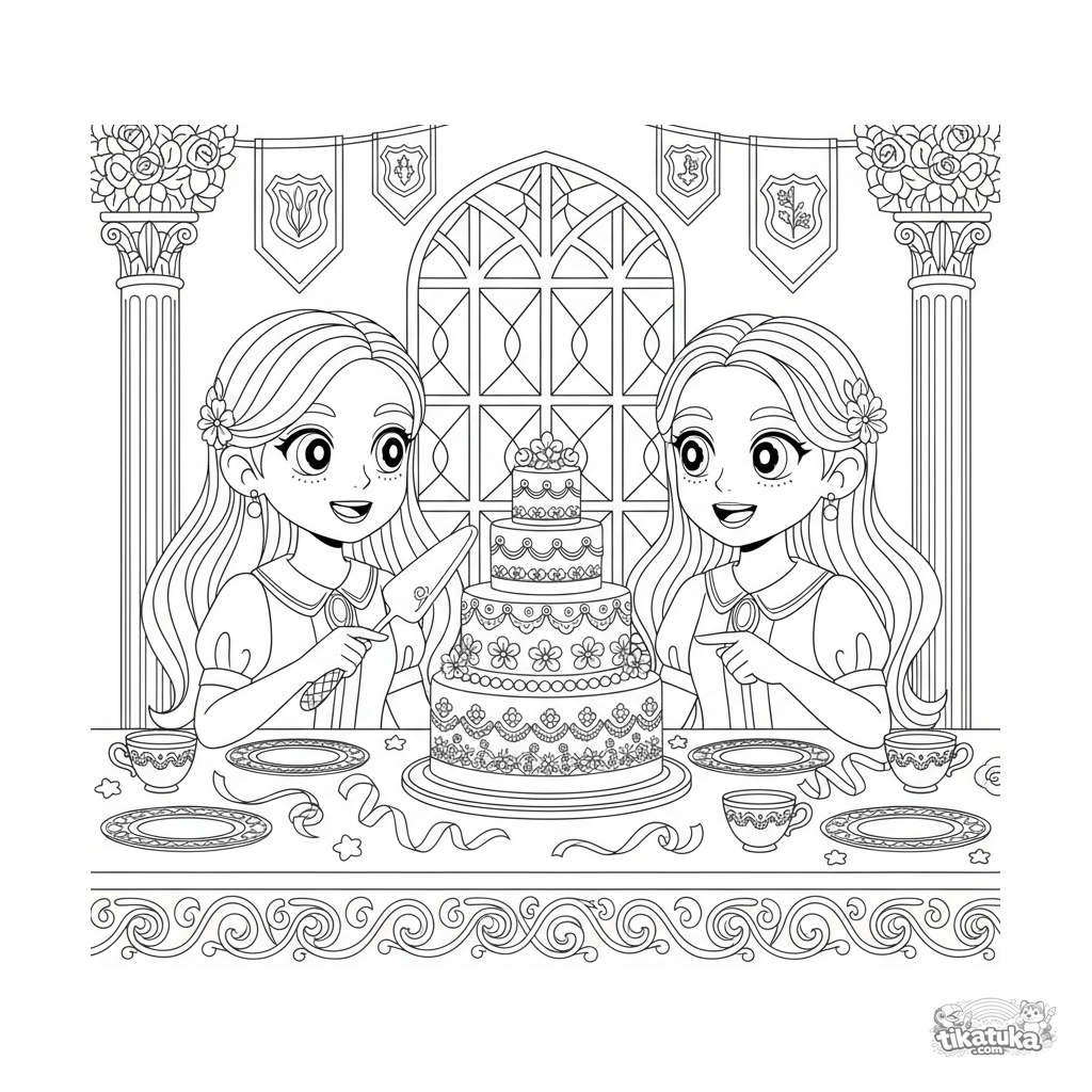 Página para colorear detallada para niños mayores 10-12: dos amigas compartiendo un pastel festivo en una mesa en un salón decorado. Escena de amistad.