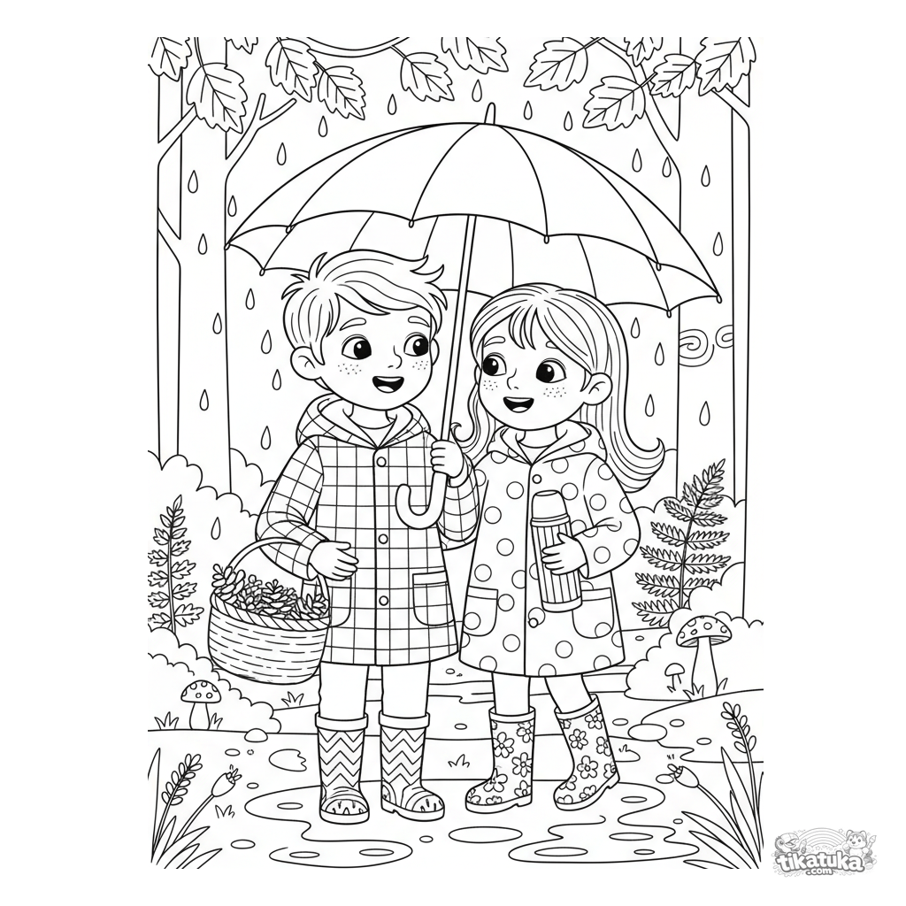 Página para colorear para preadolescentes de 7-9 años: dos amigos caminan bajo un paraguas en un sendero forestal embarrado bajo la lluvia otoñal, llevando una cesta de piñas. Detalle moderado, escena con ambiente.