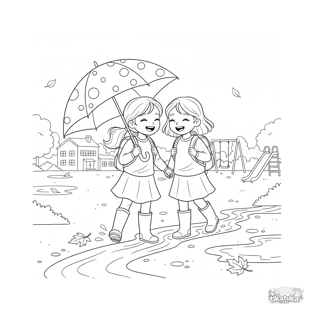 Página para colorear para niños de 7-9 años: dos amigos compartiendo un paraguas caminan por un patio escolar mojado en otoño. Escena con ambiente, detalle moderado.
