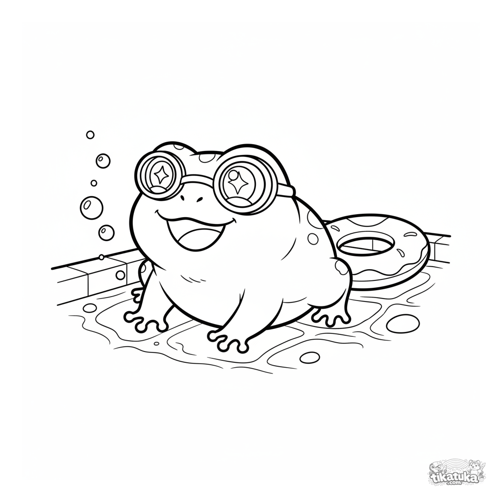 Página para colorear de una rana buceadora con gafas en el fondo de la piscina. Para niños de 7 a 9 años.