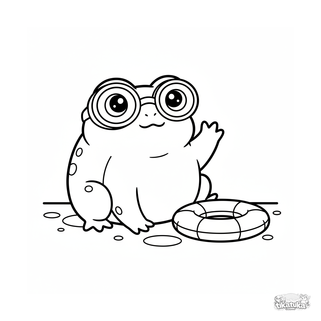 Página para colorear para niños pequeños 2-3: una rana con gafas sentada en el fondo de la piscina. Formas grandes y simples, pocos detalles.