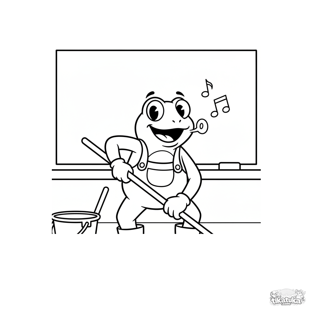 Página para colorear para niños pequeños 2-3: un alegre conserje rana con overol friega el suelo bajo la pizarra escolar en un aula, formas simples.