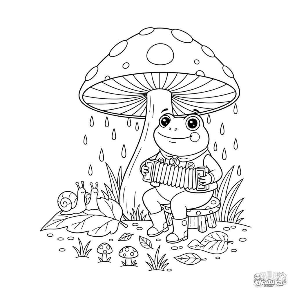 Página para colorear para niños 4-6 años en estilo folclórico: una rana con chaleco y botas toca un acordeón bajo un hongo gigante bajo la lluvia.