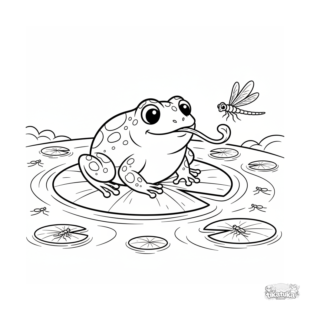 Página para colorear para niños 4-6: una rana regordeta en un nenúfar intenta atrapar una libélula sobre un arroyo claro. Escena brillante en estilo folclórico.