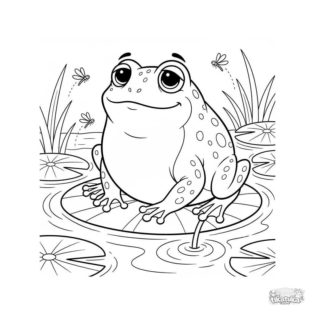 Página para colorear para niños 4-6: una rana regordeta descansa en un gran nenúfar en un arroyo tranquilo, con libélulas volando.