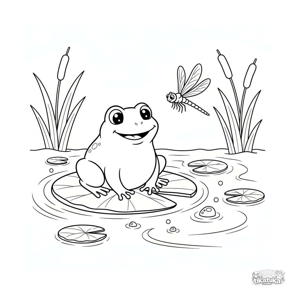 Página para colorear para preadolescentes 7-9: una rana alegre en un nenúfar junto al arroyo observando una libélula. Detalles expresivos.
