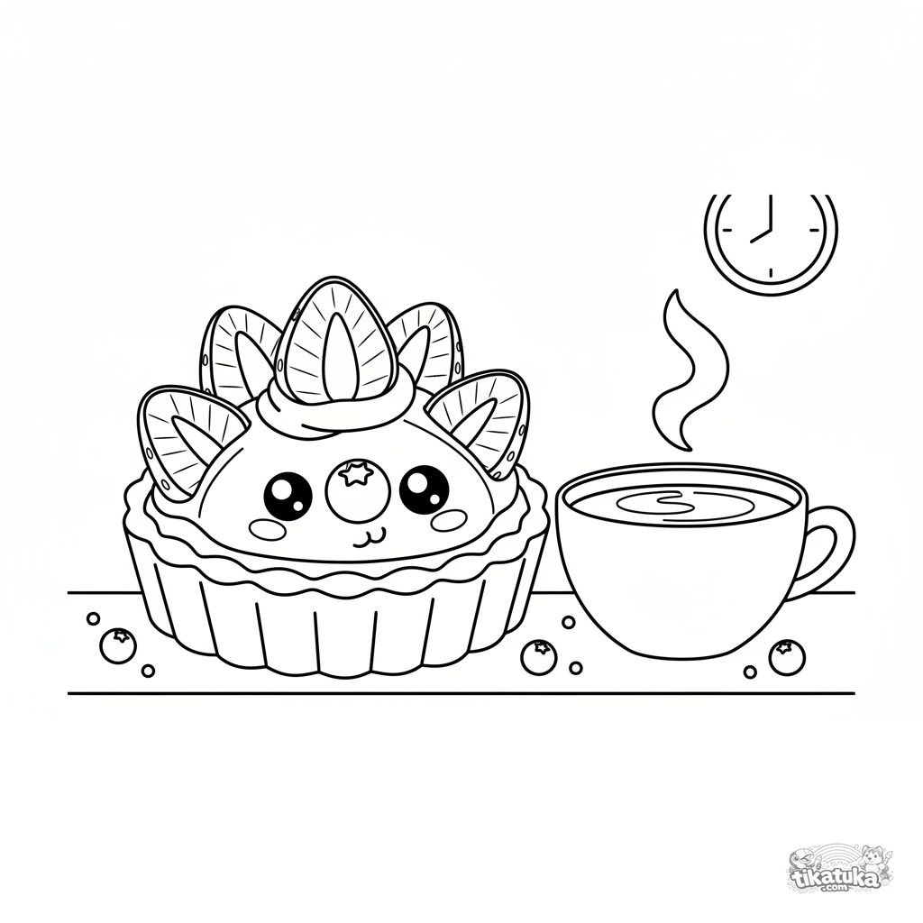 Página para colorear de una tarta de frutas equilibrando un arándano en su nariz en una barra de café. Para niños de 4 a 6 años. Con crema pastelera, fresas y una taza de café.