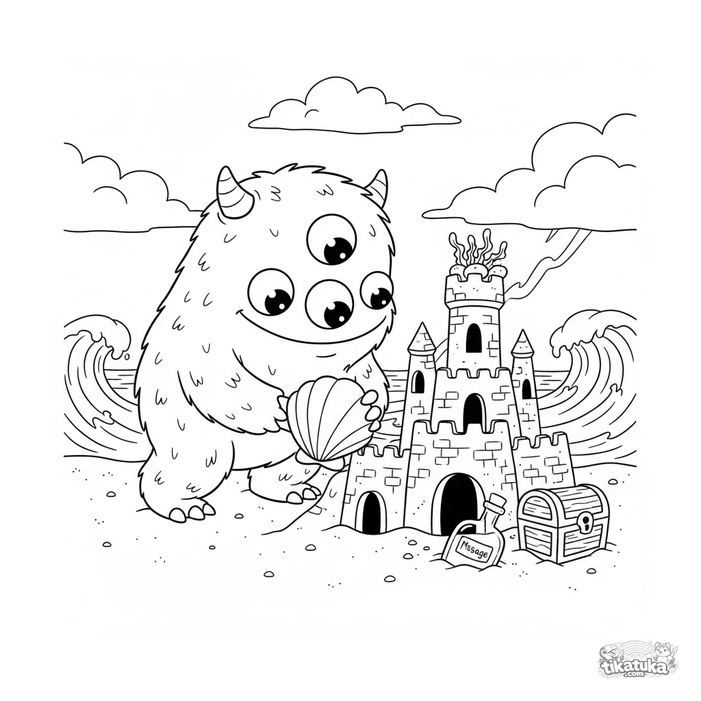Página para colorear de un monstruo peludo amigable. Para niños de 3 a 6 años. El monstruo de tres ojos construye un castillo de arena.