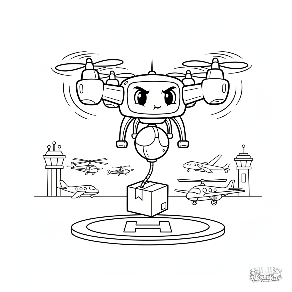 Página para colorear para niños de 4-6 años: un dron de entrega futurista en un aeródromo. La máquina inteligente baja cuidadosamente un paquete. Formas geométricas claras y detalles interesantes para colorear.