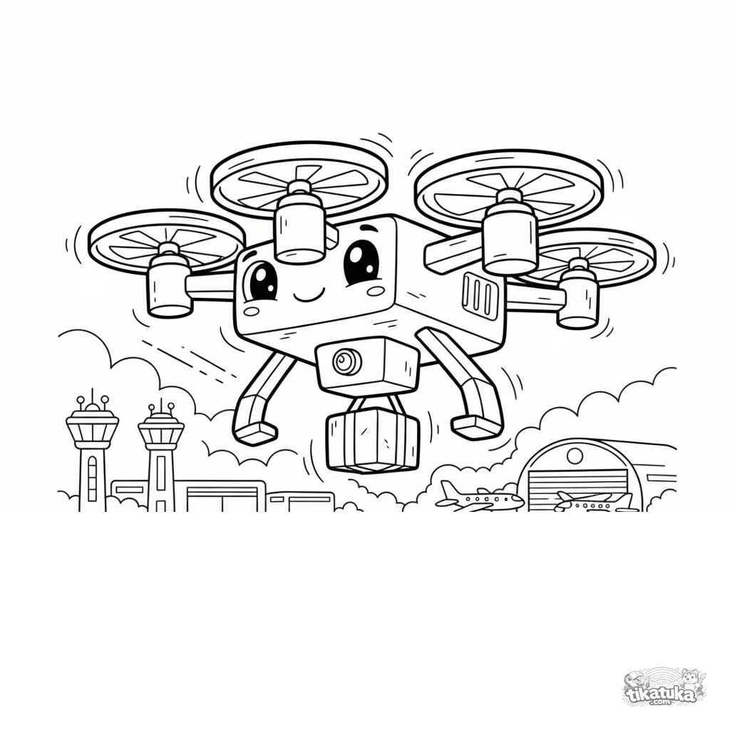 Página para colorear para niños: un dron de entrega futurista aterrizando en un aeródromo. Edad 4-6 años.