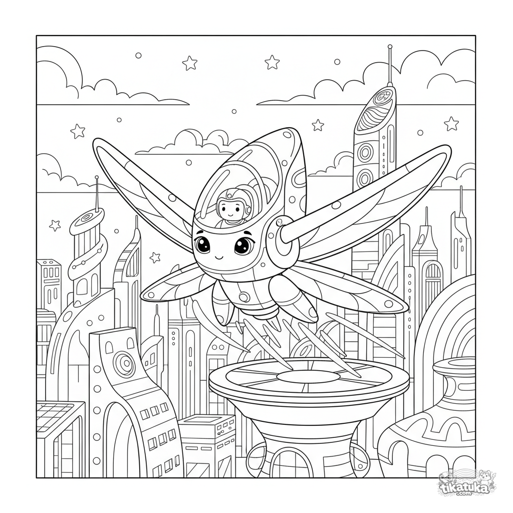 Página detallada para colorear de un vehículo alado futurista acercándose a una ciudad futura. Para niños de 10-12 años. Líneas limpias, canopy transparente, arquitectura futurista. Desafiante para colorear.