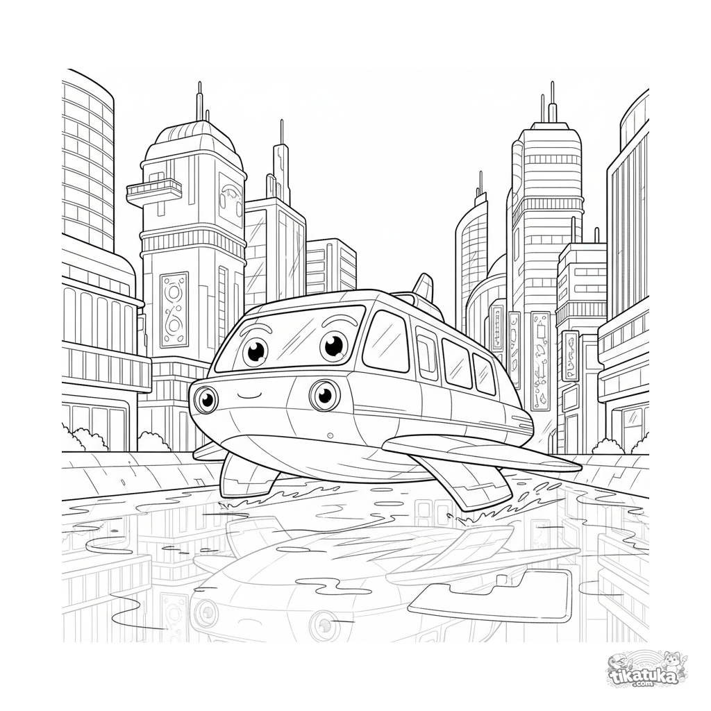 Página para colorear detallada para 10-12 años: un ferri hidroala futurista se desliza por un canal urbano con luces de neón.