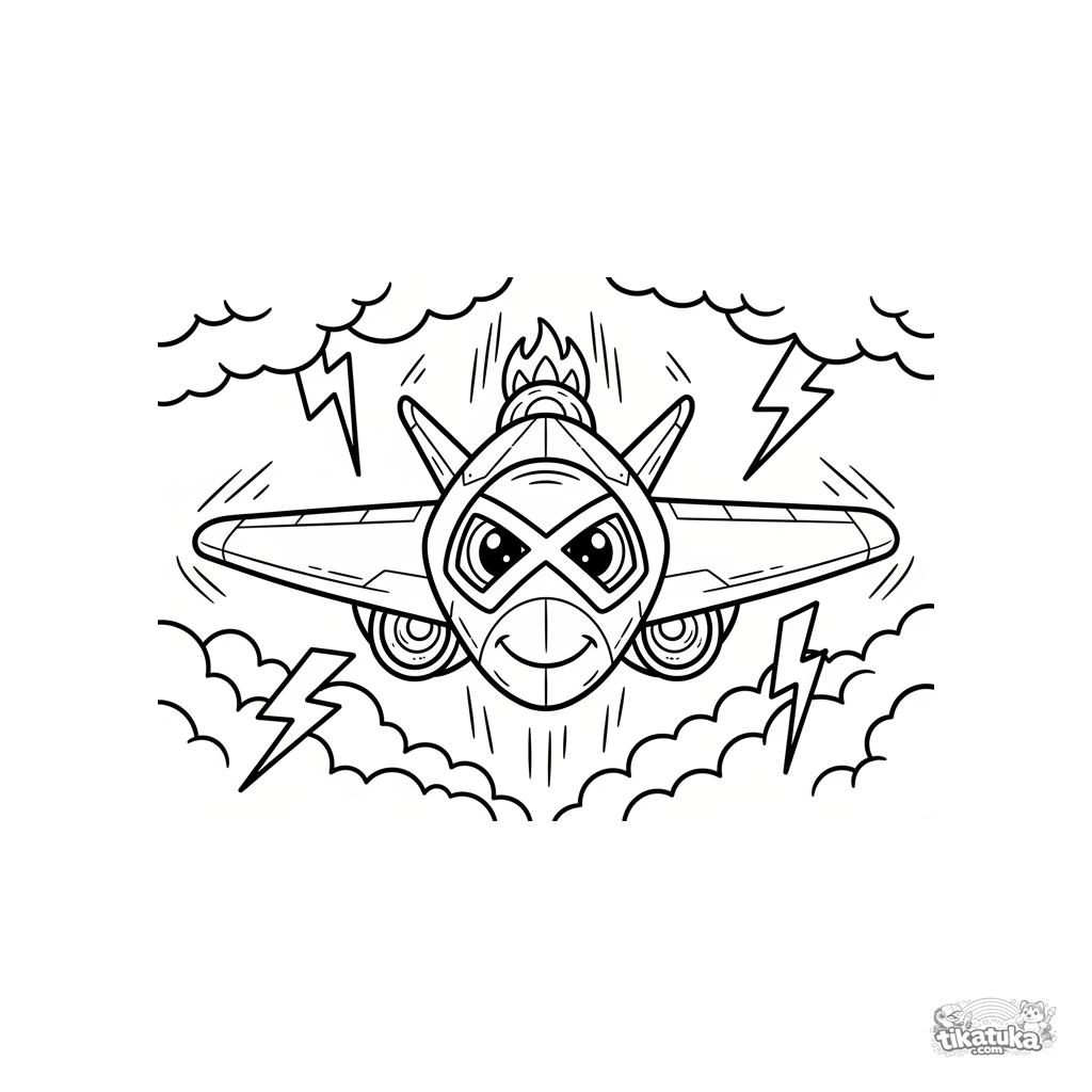Página para colorear dinámica de un jet futurista volando a través de un cielo tormentoso. Para niños de 7 a 9 años. Estilo cómic, iluminación dramática.