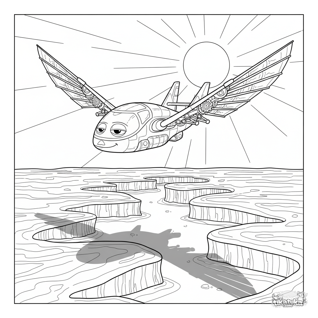 Página para colorear compleja de un ornitóptero futurista volando sobre una mesa desértica. Para niños de 10 a 12 años. Alto detalle, diseño de ciencia ficción.