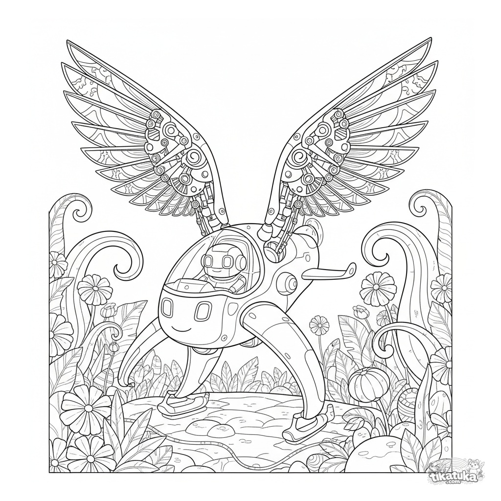 Página para colorear compleja en estilo novela gráfica para 10-12 años: un ornitóptero futurista aterriza en una jungla. Mecánica detallada y naturaleza.