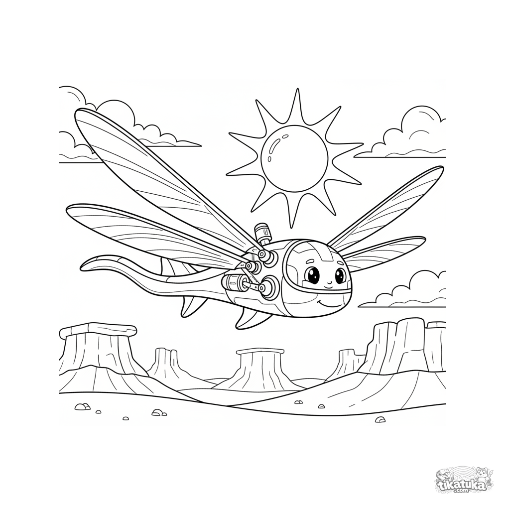 Página para colorear de fantasía de un ornitóptero, una máquina voladora con alas batientes, sobrevolando un desierto. Para niños de 4 a 6 años. Detalles mecánicos interesantes.