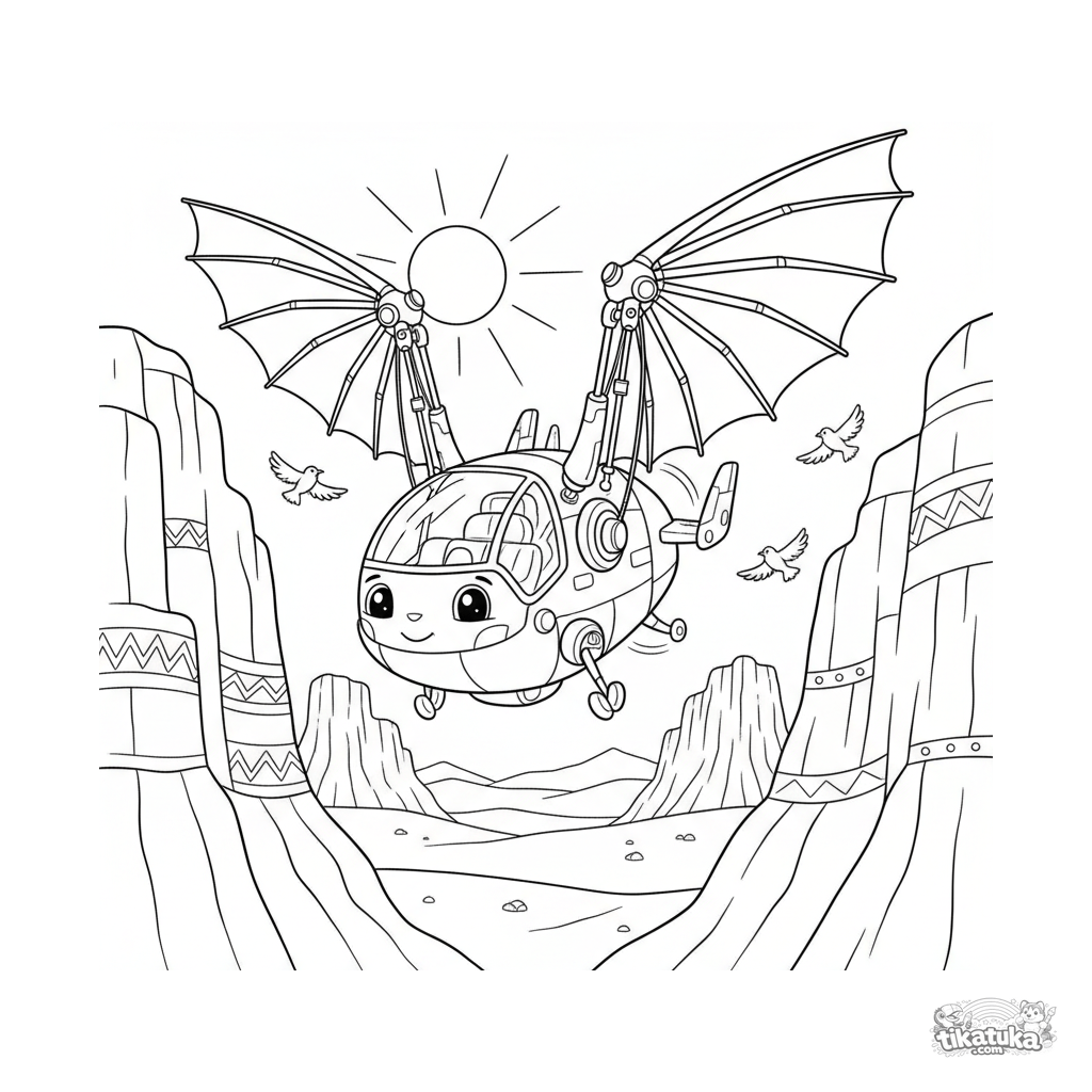 Página para colorear para niños mayores 10-12: un ornitóptero futurista con alas batientes se eleva sobre cañones desérticos.