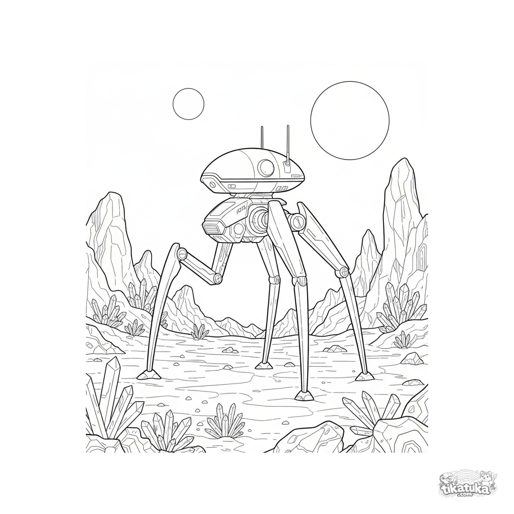 Página para colorear para niños mayores: un caminante explorador de cuatro patas en una llanura rocosa alienígena. Para 7-12 años.