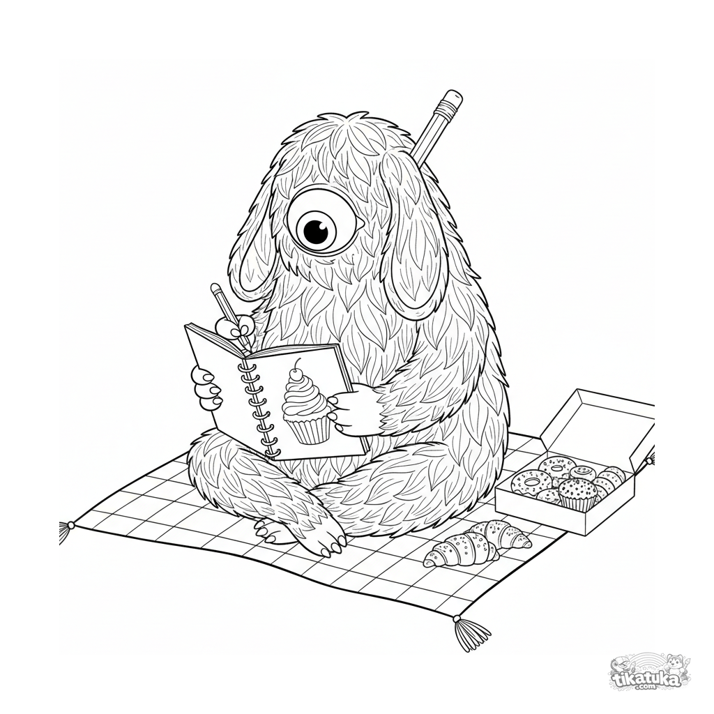 Página para colorear detallada para niños de 10-12 años: un monstruo peludo en estilo realista dibujando dulces de un picnic.