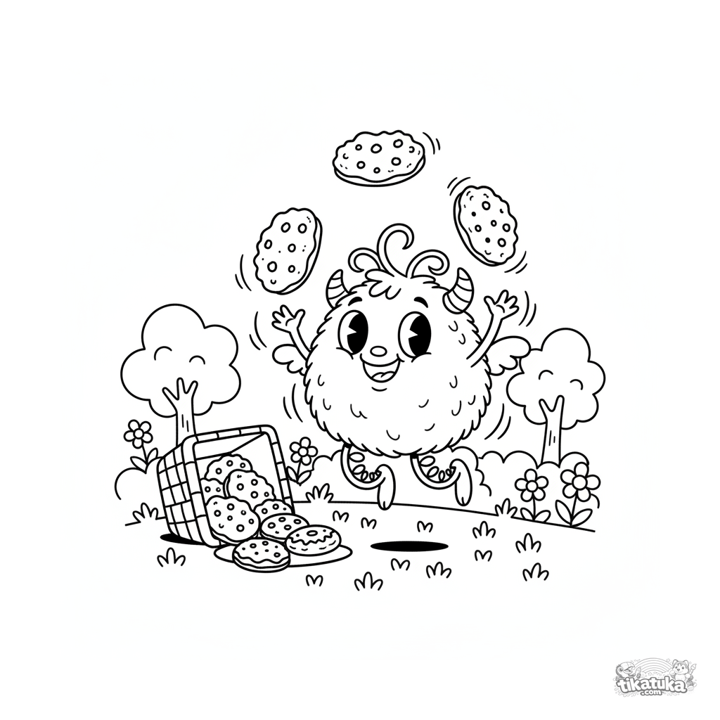 Página para colorear de un monstruo peludo con piernas de muelle haciendo malabares con galletas en un picnic. Escena dinámica para niños de 7-9 años.