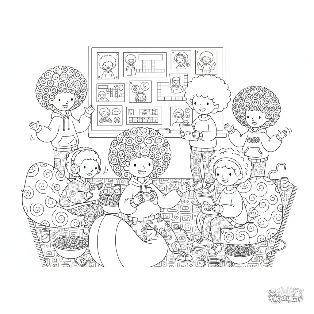Página para colorear vibrante para 10-12 años: un equipo de desarrollo de juegos haciendo lluvia de ideas en un salón de sótano. Pizarra con bocetos, prototipo de controlador, puffs.