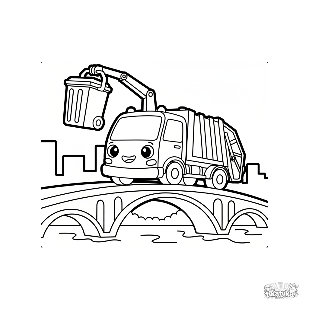 Página muy simple para colorear para bebés 2-3 años: un camión de basura amigable conduciendo por un puente. Formas grandes y redondas, cara sonriente.