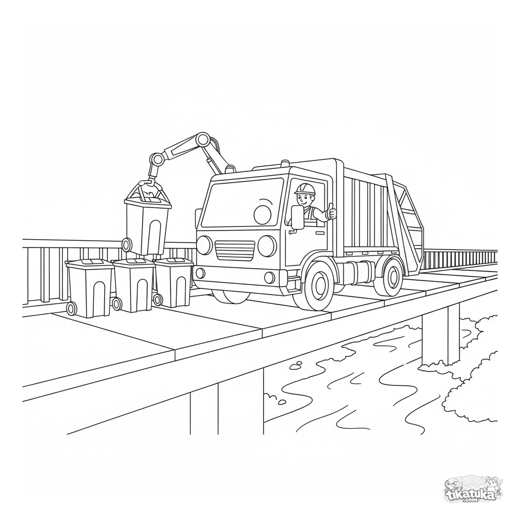 Página para colorear para niños de 4-6 años: un camión de basura moderno con un brazo robótico recoge residuos en un puente de la ciudad sobre un río. Formas claras, acción comprensible, estilo catálogo de juguetes.