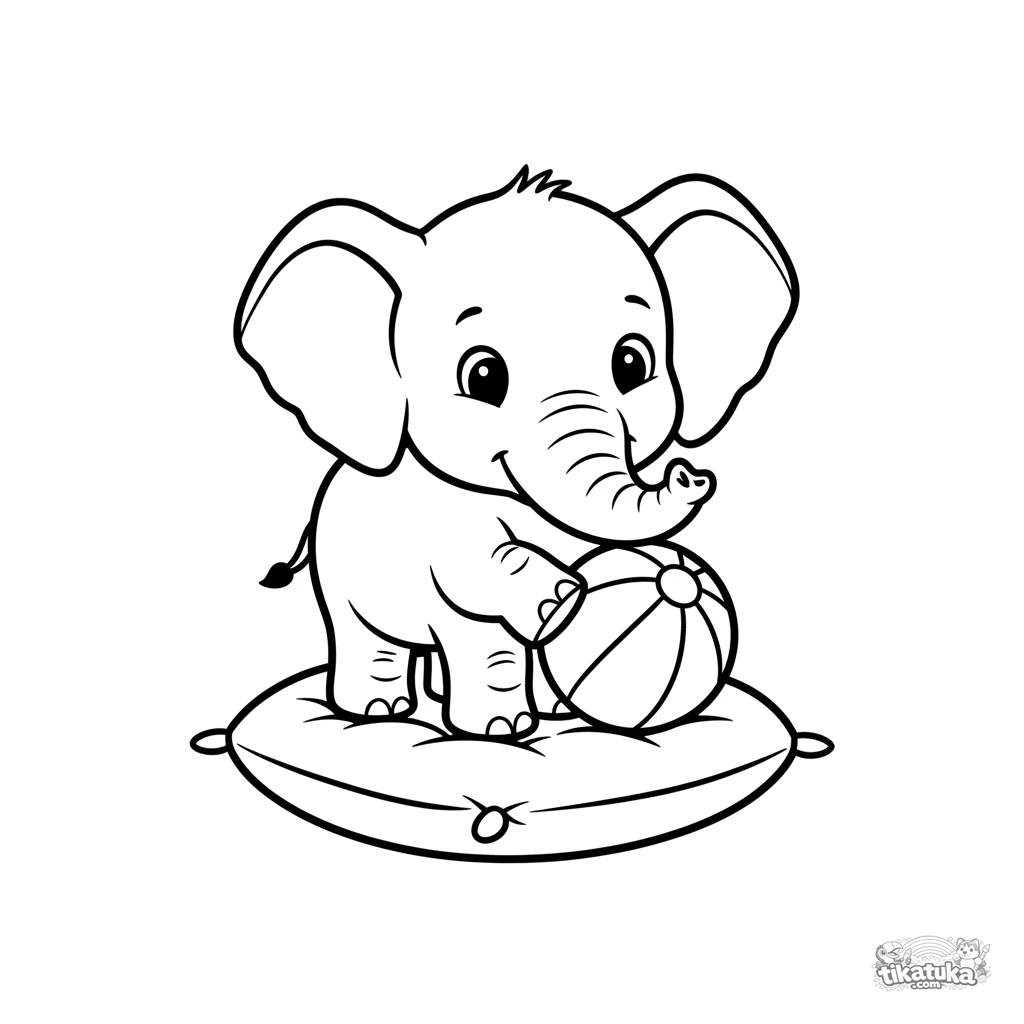 Página para colorear para niños de 2-3 años: un amable bebé elefante se para en un cojín sosteniendo una pelota grande con su trompa. Formas claras, realistas pero simples con detalles grandes.