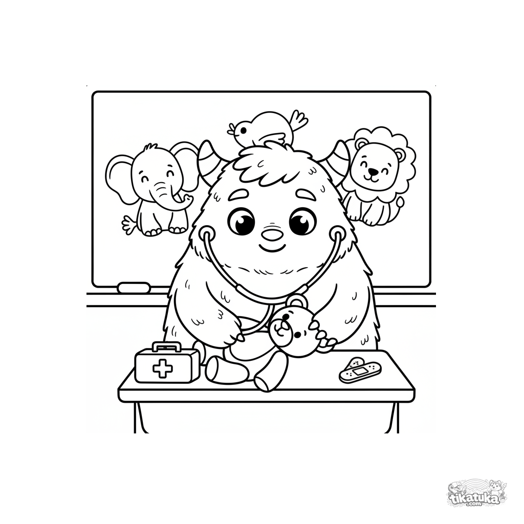 Página simple para colorear para bebés 2-3 años: un gran monstruo veterinario amable con estetoscopio examina un osito de peluche en un pupitre. Formas grandes y suaves, muy pocos detalles.