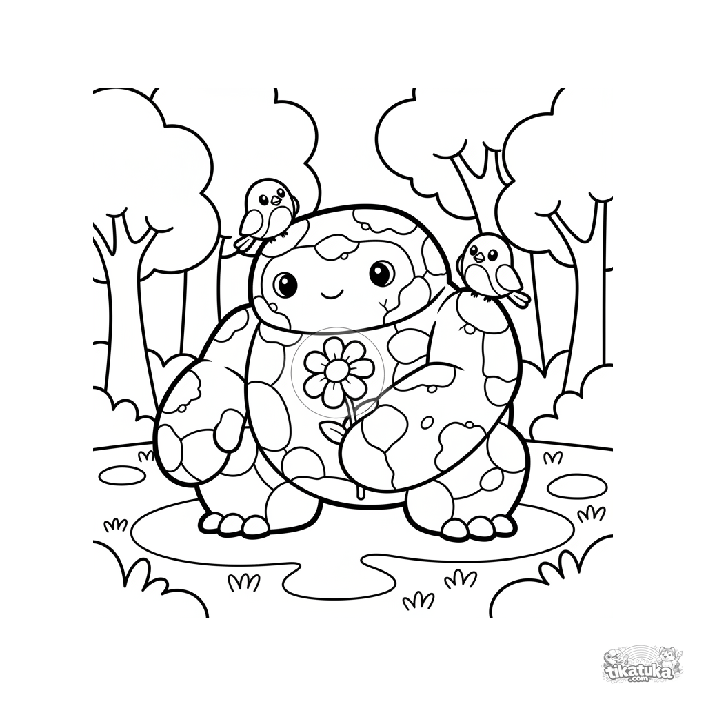 Página para colorear simple para niños pequeños 2-3: un gran gólem de roca amable agachado en un prado, sosteniendo una flor brillante.