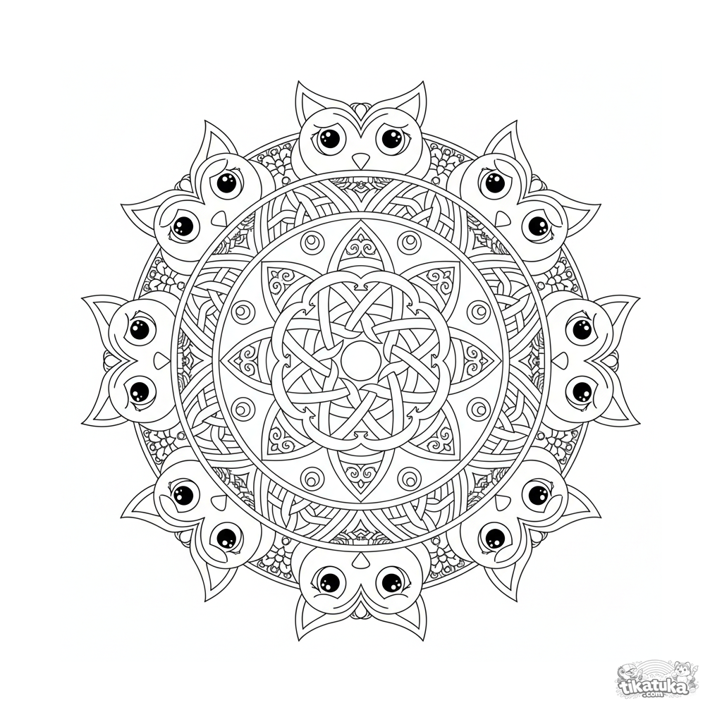 Complejo mandala geométrico con nudo celta para colorear. Patrones entrelazados y símbolos, ideal para niños de 10 a 12 años.