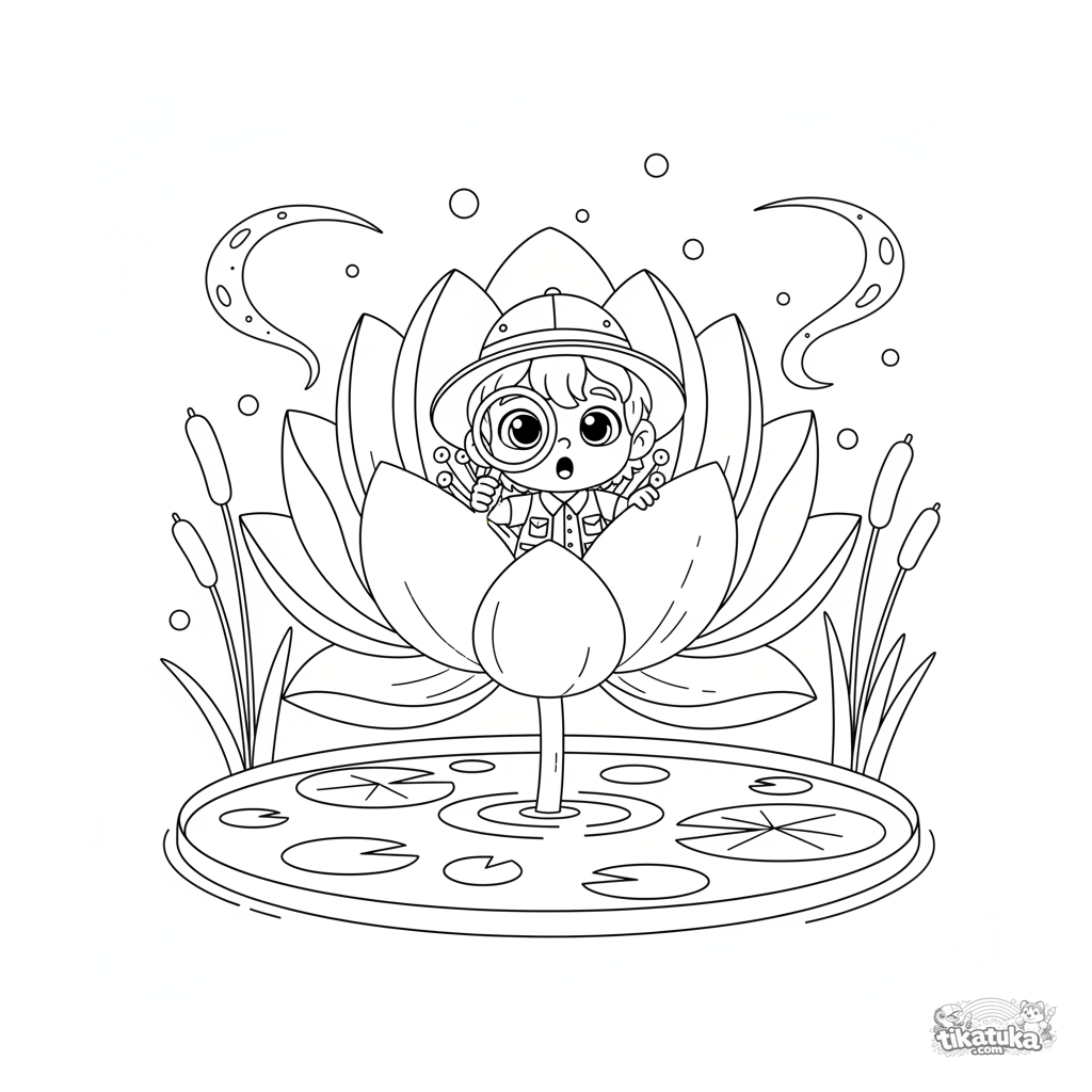 Página para colorear para niños 7-9: una flor de loto mágica gigante con un niño explorador en un estanque. Líneas claras, amplios márgenes.