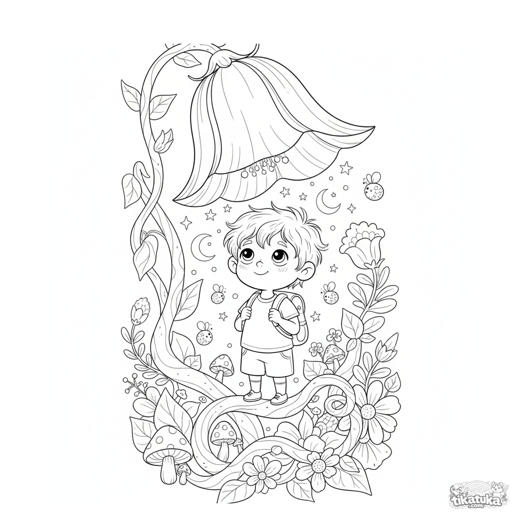Página para colorear para niños de 7 a 9 años: un niño dentro de una flor de luna gigante mágica en un jardín nocturno. Escena fantástica.