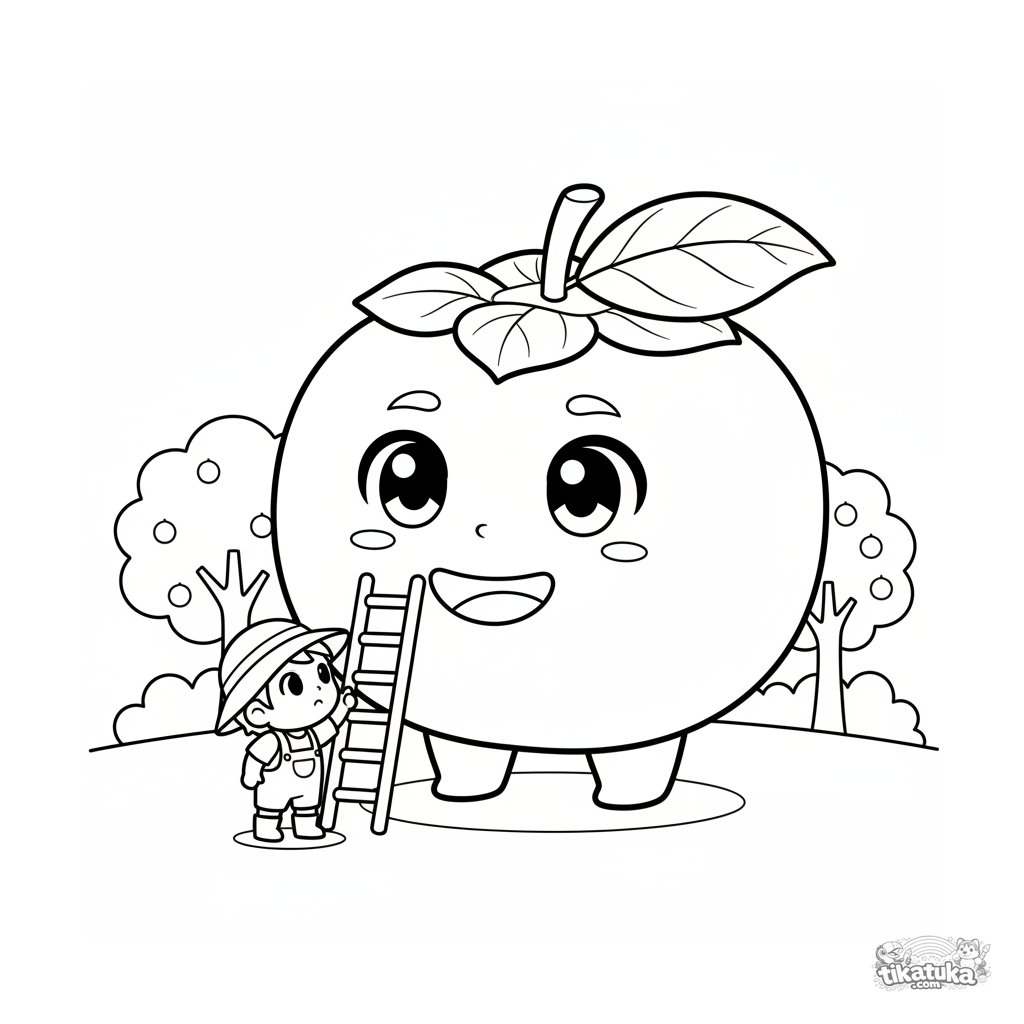 Página para colorear para niños 4-6: un caqui gigante alegre y un jardinero pequeño con una escalera en un huerto. Estilo chibi.