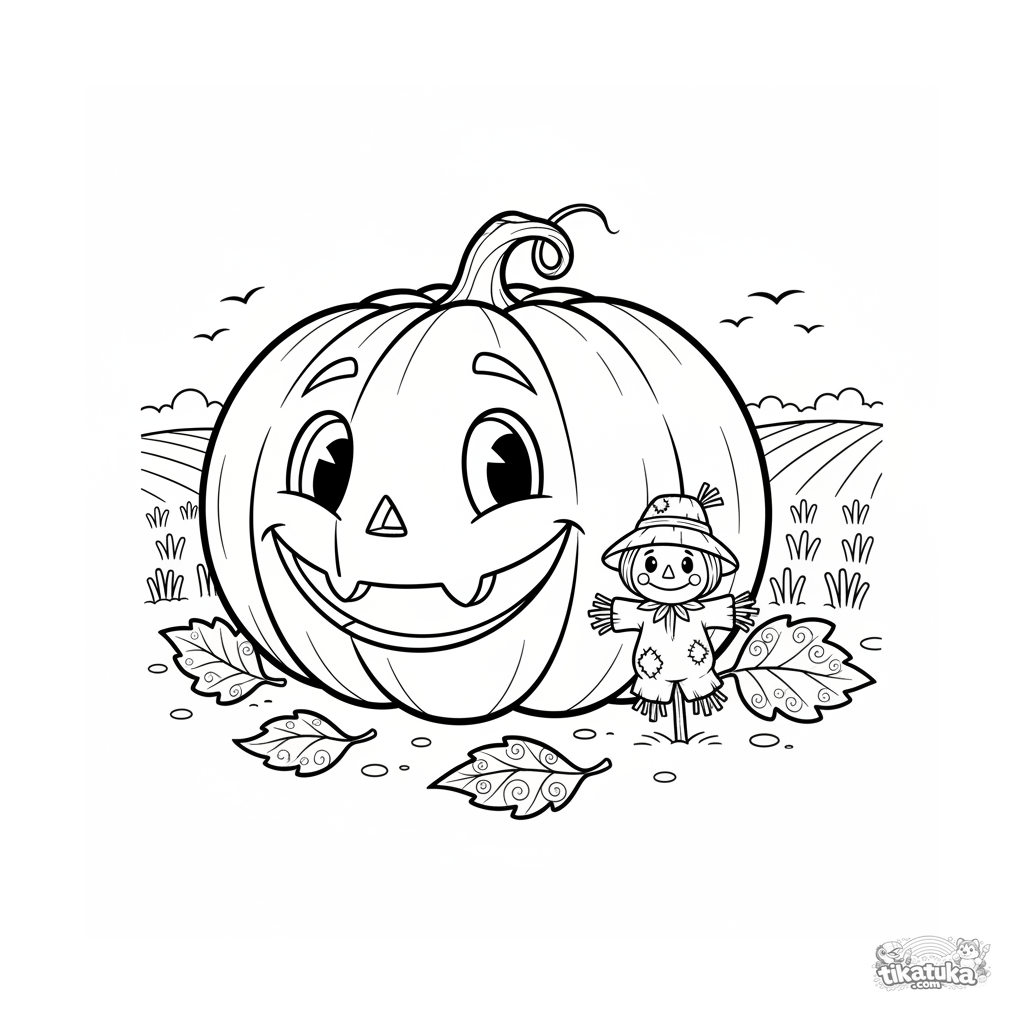 Página divertida para colorear para niños 4-6: una calabaza gigante sonriente y un espantapájaros pequeño en campo otoñal. Estilo folk, contraste de tamaño.