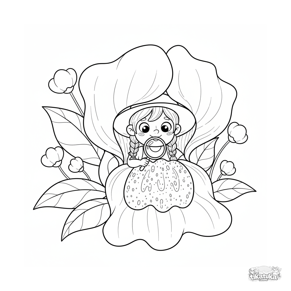 Página para colorear para niños de 7-9 años: un niño explora una flor gigante de boca de dragón. Escena de jardín con muchos detalles.