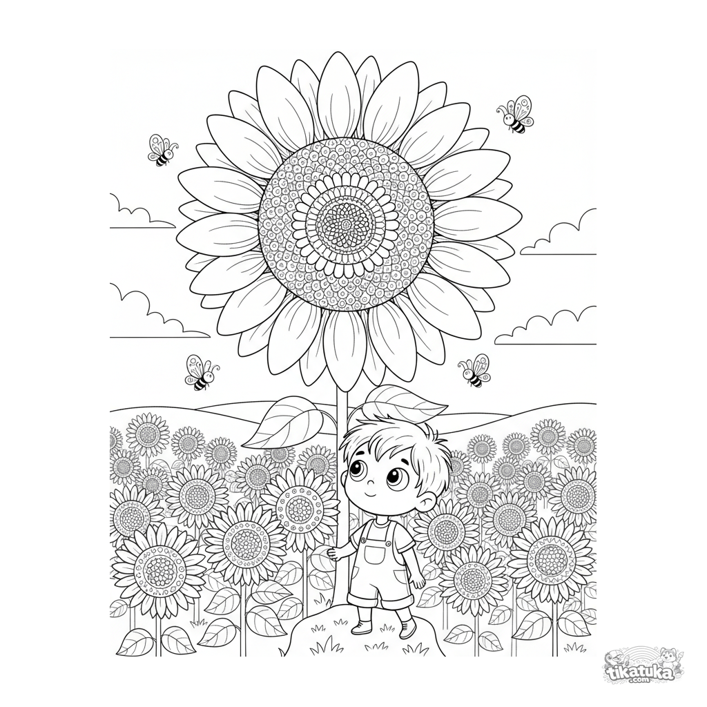 Página detallada para colorear para niños mayores de 10-12 años. Un girasol gigante fantástico en un campo, con un niño asomándose. Escena compleja, detalles ricos.
